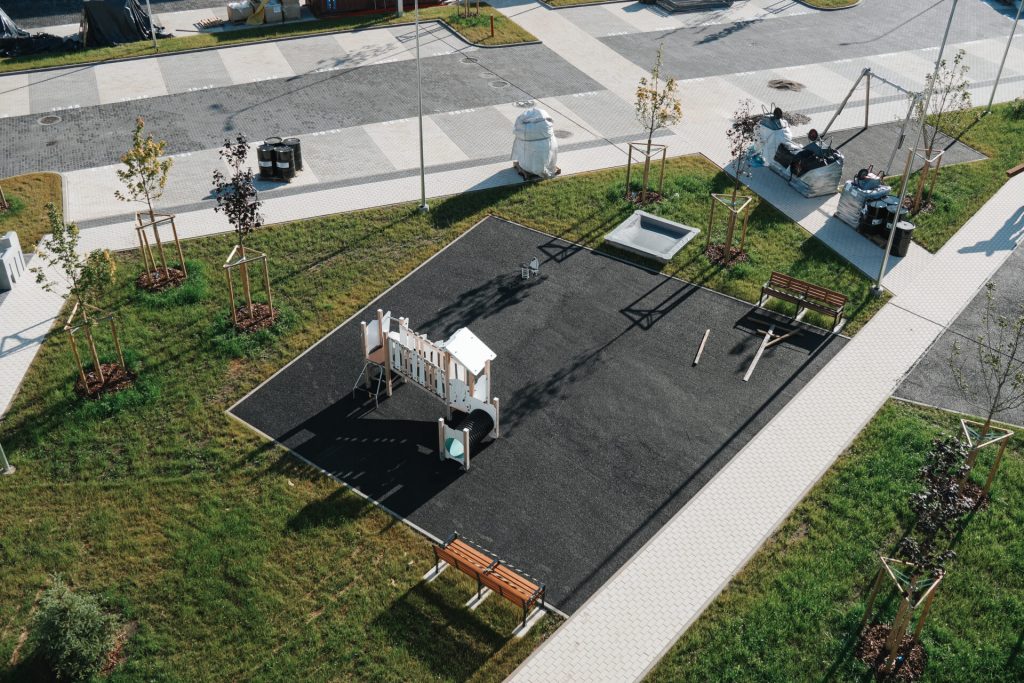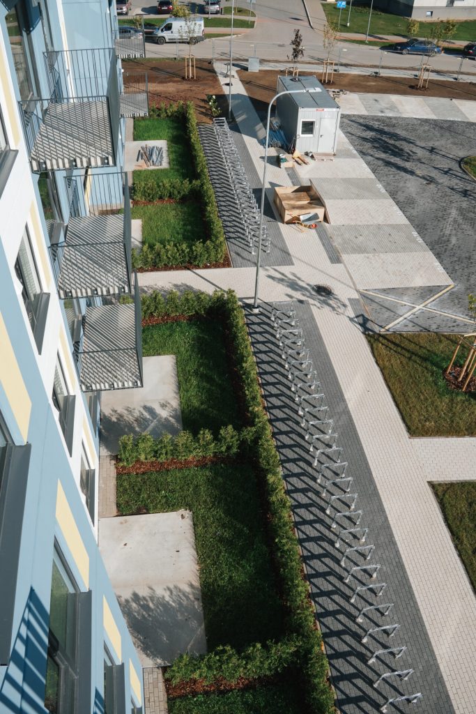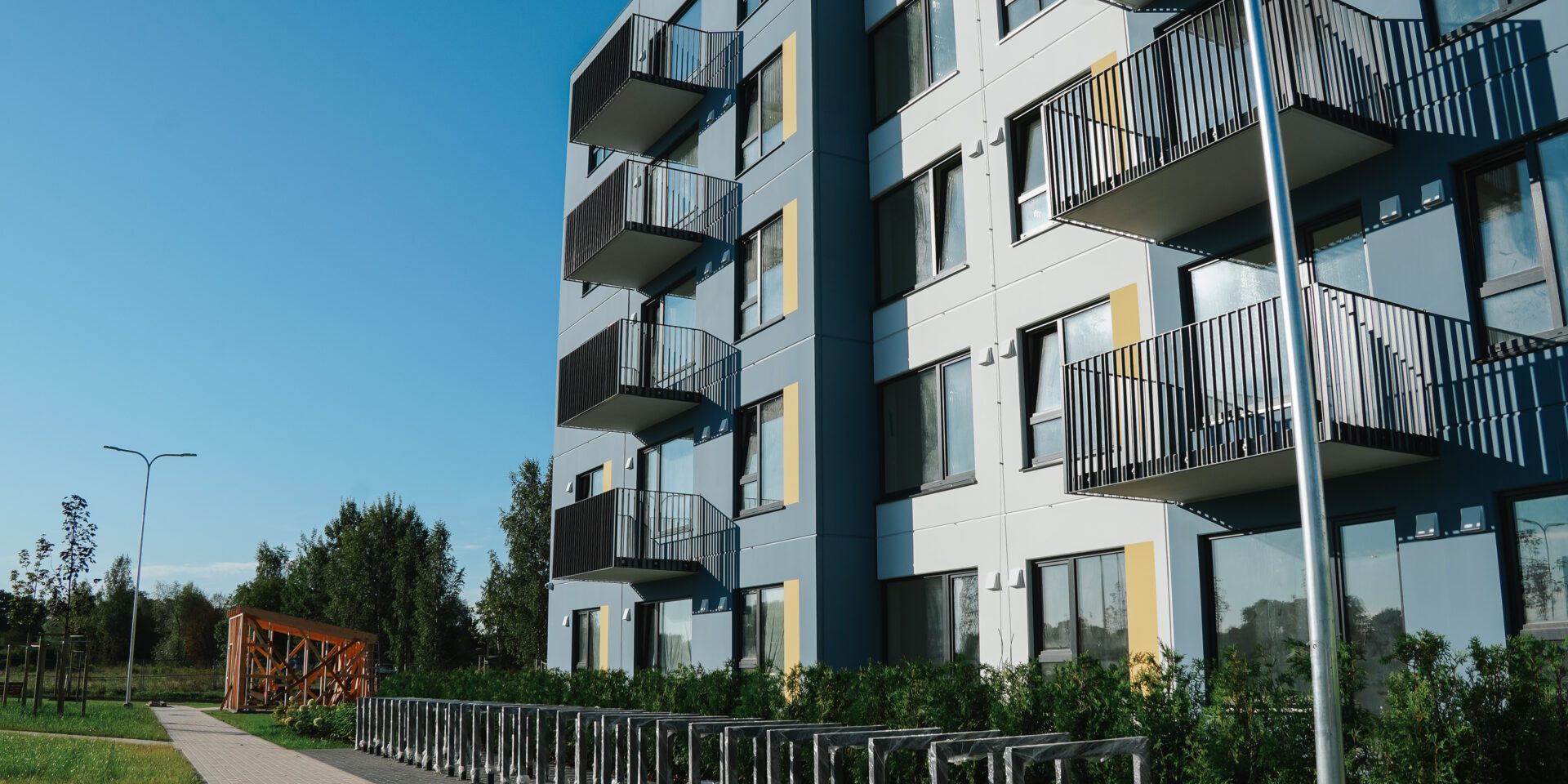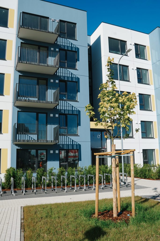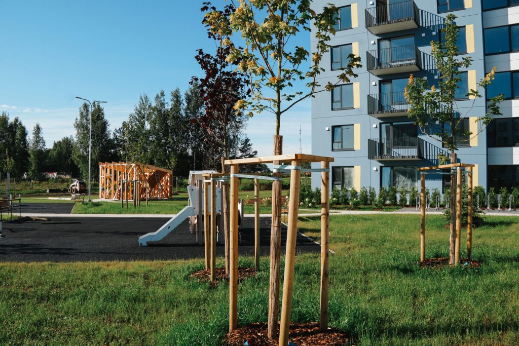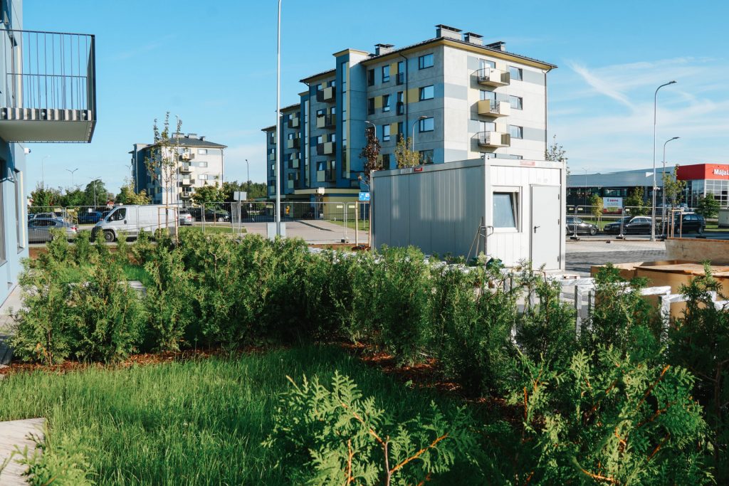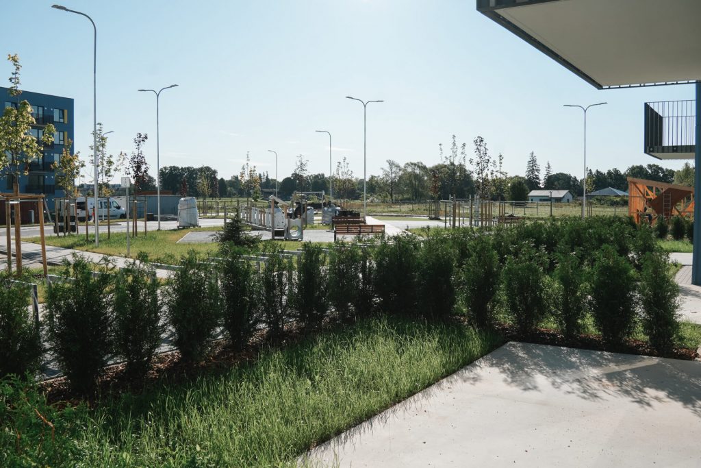Dzīvokļu izkārtojums, interjers un iekārtojums katrā stāvā ir vienāds, tostarp viena telpa ir apvienota ar virtuvi. Īrniekiem būs pieejama virtuves iekārta ar izlietni, indukcijas plīti, elektrisko cepeškrāsni, tvaika nosūcēju, kā arī ar iespēju iebūvēt trauku mazgājamo mašīnu. Visas elektroierīces izvēlētas, lai būtu pēc iespējas ar zemāku elektroenerģijas patēriņu. Ierīkota arī nepieciešamā santehnika. Lai nodrošinātu labu gaisa kvalitāti un energoefektivitāti, ierīkota ventilācija ar rekuperāciju. Atsevišķiem dzīvokļiem pieejams balkons, bet pirmā stāva dzīvokļiem – neliela terase. Katrai ēkai paredzēta viena slēgta velo novietne. Pie ēkām labiekārtota teritorija ar atpūtas zonām, rotaļlaukumu un pazemes atkritumu konteineriem. Stāvlaukumā katram dzīvoklim būs nodrošināta viena noteikta un pastāvīga bezmaksas autostāvvieta.